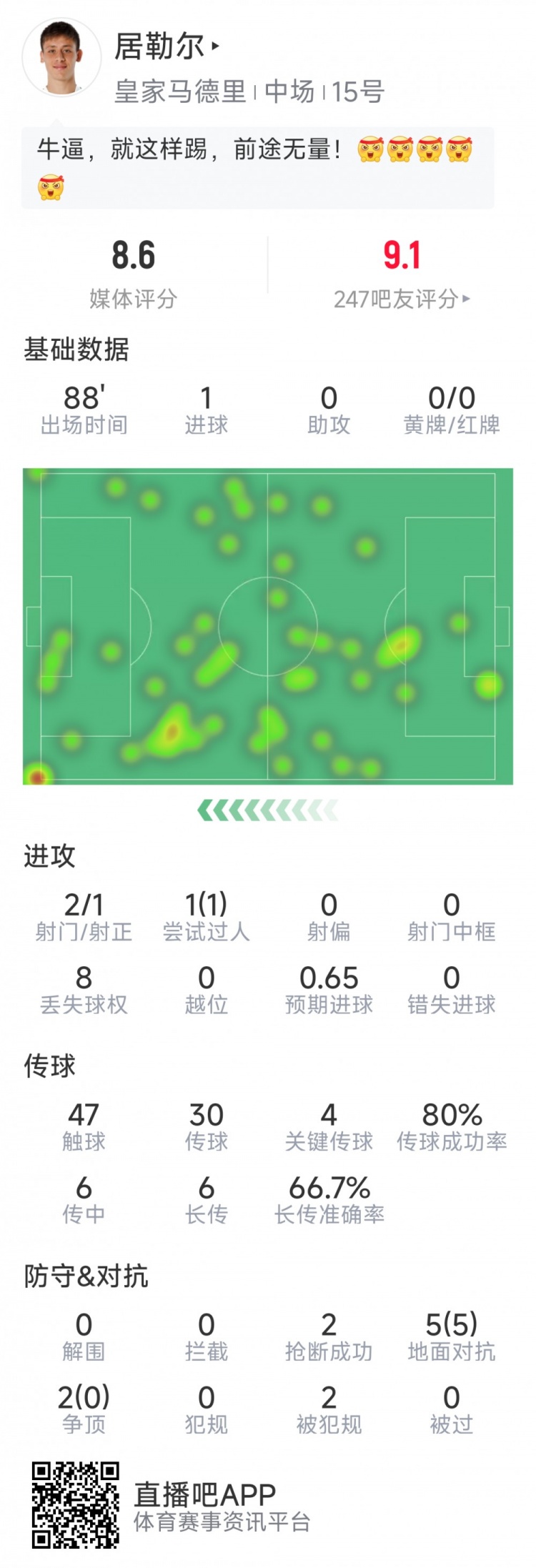 居勒尔本场数据:1粒得分 ,2射1正,4次关键传送球 ,2次抄截