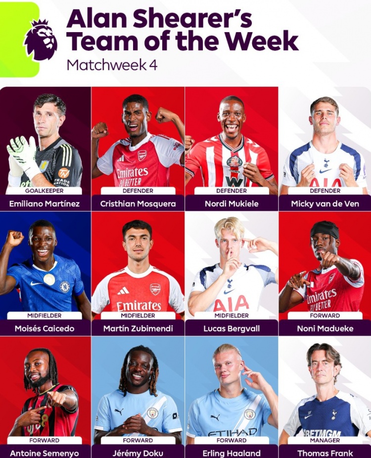 前场球员:马杜埃凯(阿森纳)、塞梅尼奥(伯恩茅斯)、多库(曼城)、哈兰德(曼城)