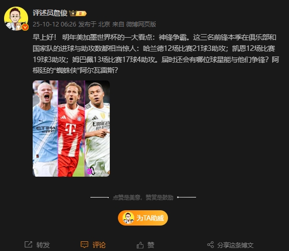 詹俊:早上好! 明年美加墨世界杯赛 的一大看点:神锋争霸西甲新闻新浪网。这三名前场球员本季在俱乐部和国家队的得分 与助功 数都相当惊人:哈兰德12场赛事 21球3助功 ;凯恩12场赛事 19球3助功 ;姆巴佩13场赛事 17球4助功 。届时还会有哪位球星能与他们争锋?阿根廷的“蜘蛛侠”阿尔瓦雷斯?