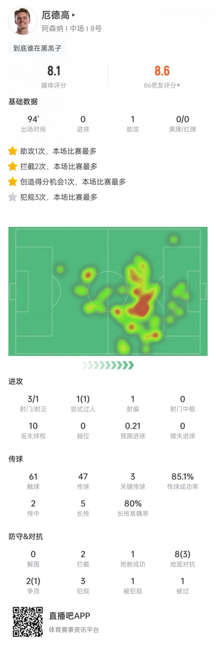 苏超冠军 厄德高数据: 3次关键传送球 +送出助功 , 5次长传4次成功, 获评8.1分
