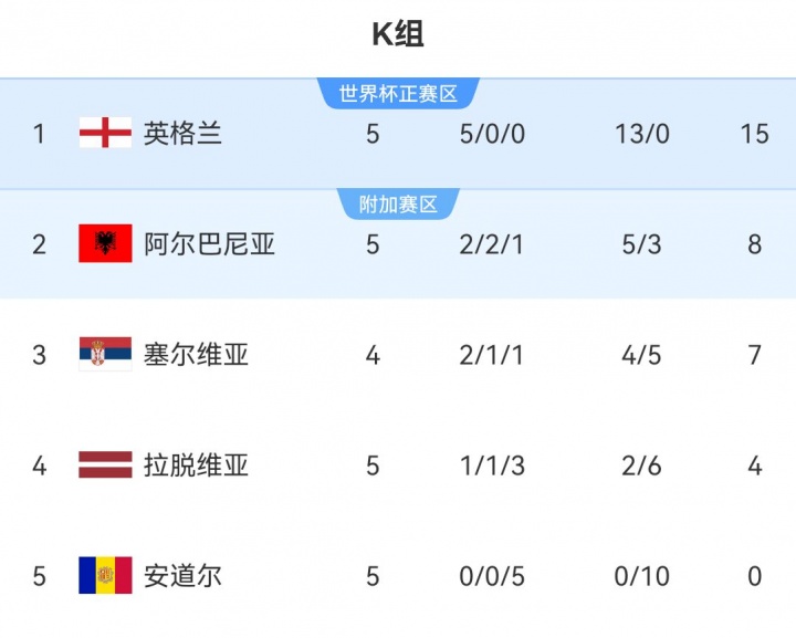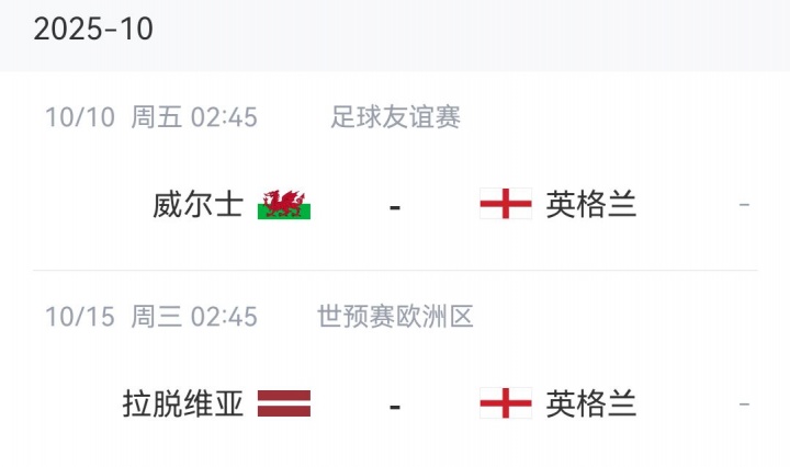 英格兰将于10月10日在友情 赛中对阵威尔士,10月15日世预赛客场应战 应战 拉脱维亚。目前,英格兰在世预赛欧洲区K组5战全胜排名小组第1。