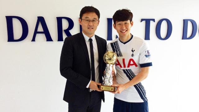 孙继海为孙兴慜颁发2015年亚洲金球奖奖杯