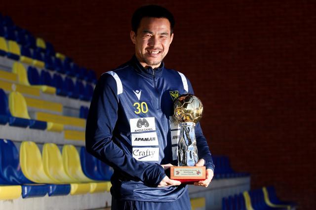 2023年2月,冈崎慎司在比利时圣特吕登捧起了因故延迟颁发的亚洲金球奖奖杯