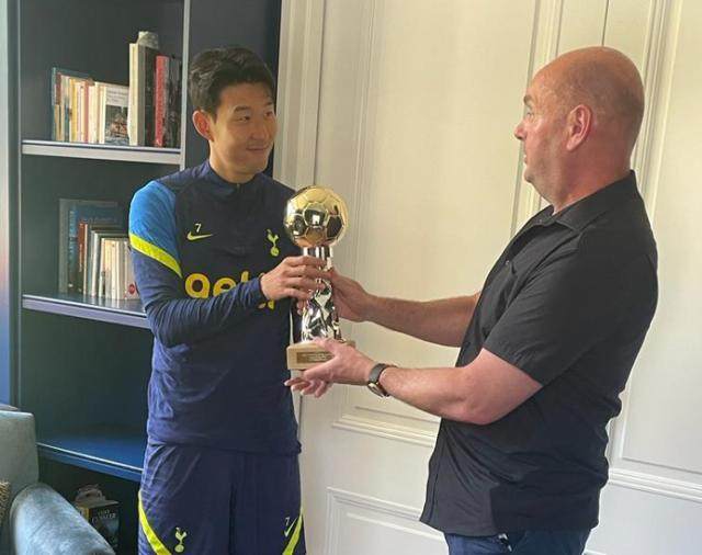 孙兴慜从亚洲金球奖评委会嘉宾杜尔登向孙兴慜颁发2021年亚洲金球奖