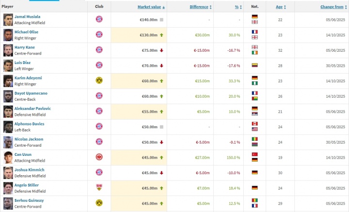 10月14日讯 德转更新德甲身价,奥利塞身价暴涨3000万欧元,从1亿跃升至1.3亿欧,穆西亚拉1.4亿不变。