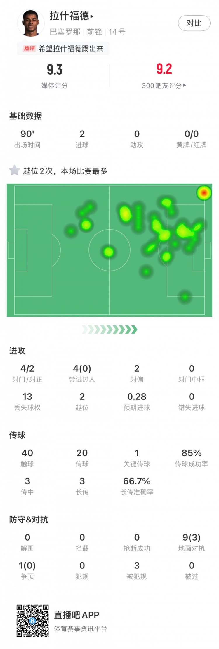 拉什福德数据:4次射球 2得分 ,预期得分 0.28,1关键传送球 ,评分9.3