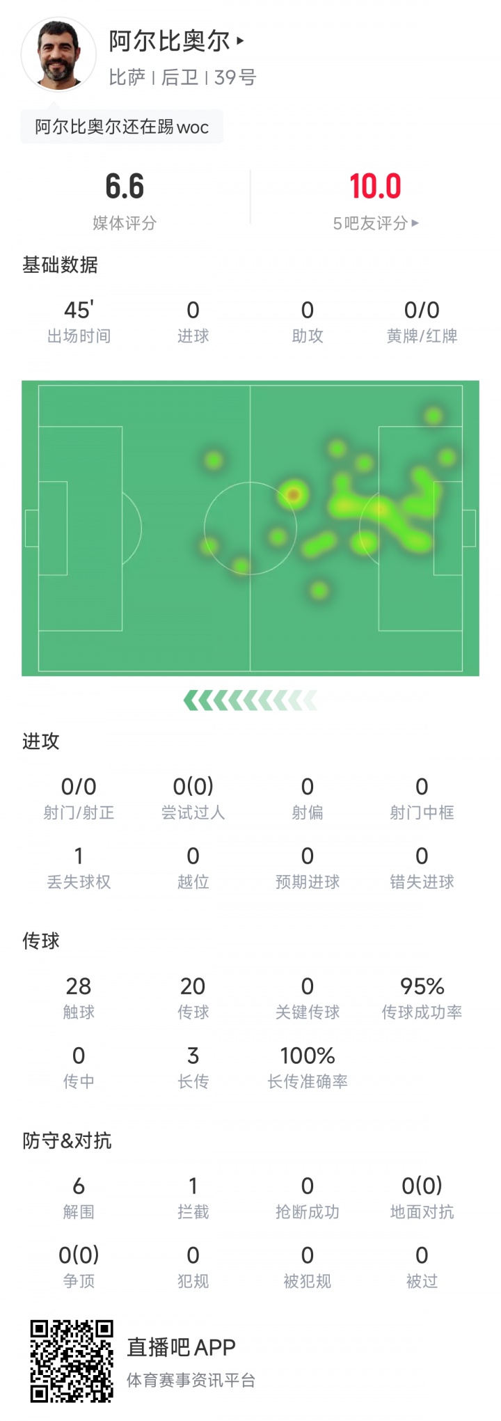 40岁的阿尔比奥尔本场没能打满全场,他在下半场被换下。这位曾经的西班牙国脚贡献6解围1阻拦 0被过的防卫 数据,苏超直播28次触球仅有1次丢球权。