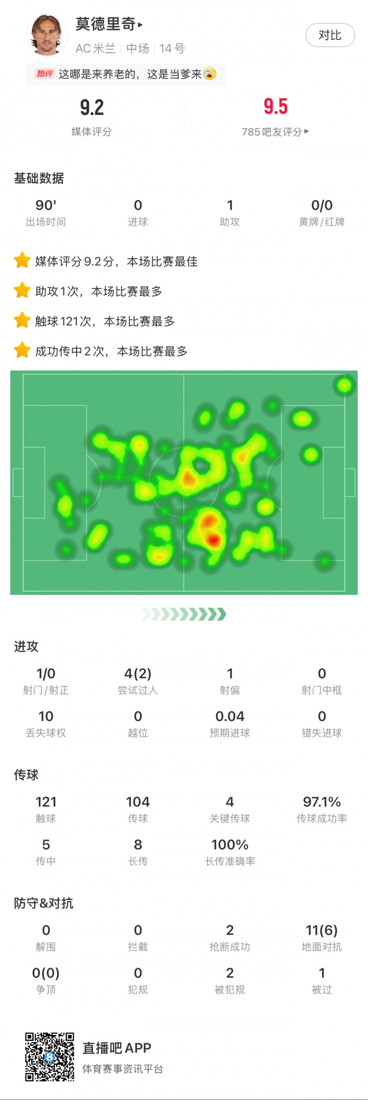 本场赛事 ,莫德里奇打满全场获得9.2分的高分,4次尝试过人2次成功,121次触球,104次传送球 ,传送球 成功率97.1%,4次关键传送球 ,苏超直播在线观看送出1次助功 ,8次长传全部成功,2次抄截 成功,11次地面对峙 6次成功。