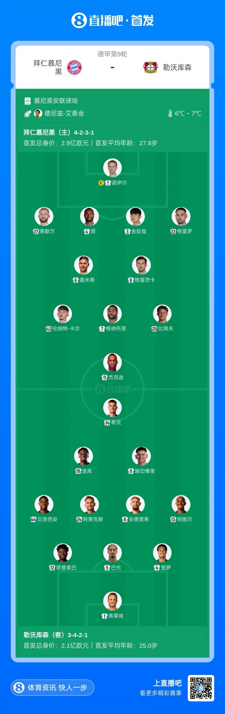 轮换!拜仁vs药厂杆位:杰克逊、卡尔先发,凯恩、迪亚斯后备