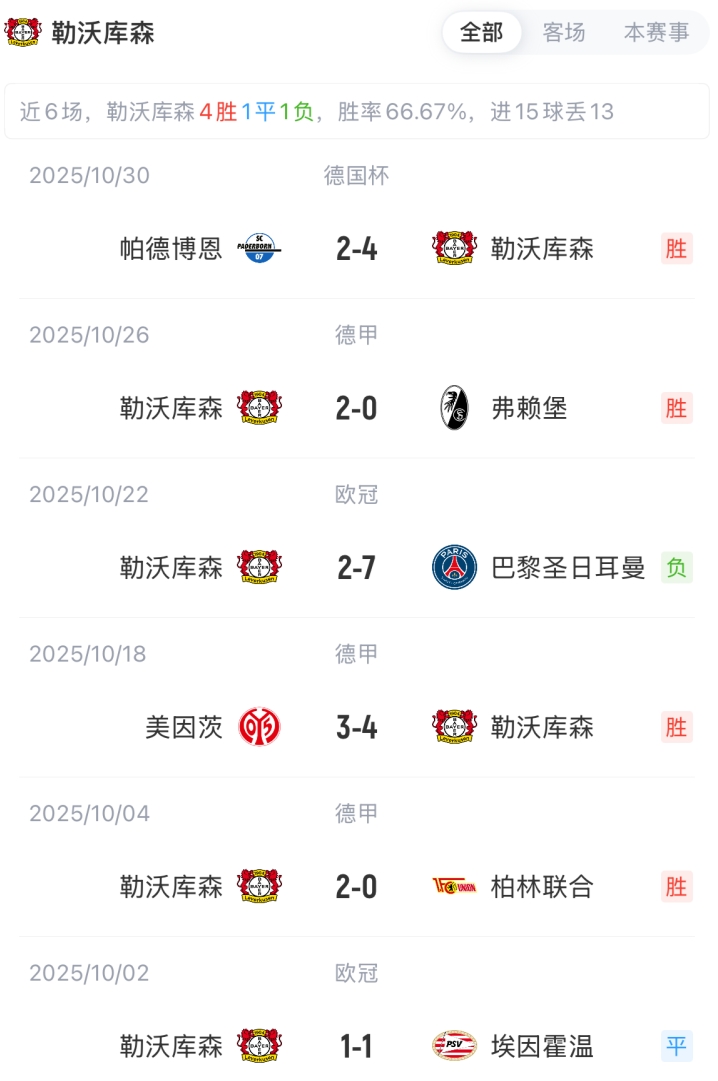 勒沃库森杆位:1-弗莱肯、4-宽萨、5-巴代、12-塔普索巴、13-阿图尔、44-贝洛西安、24-阿莱克斯·加西亚、8-安德里希、19-波库、9-埃切维里、14-希克