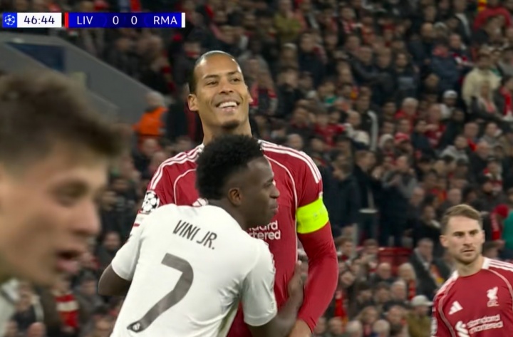 > 这是认真的吗?1米76维尼修斯底线球盯防1米95范戴克,两人嘻嘻哈哈