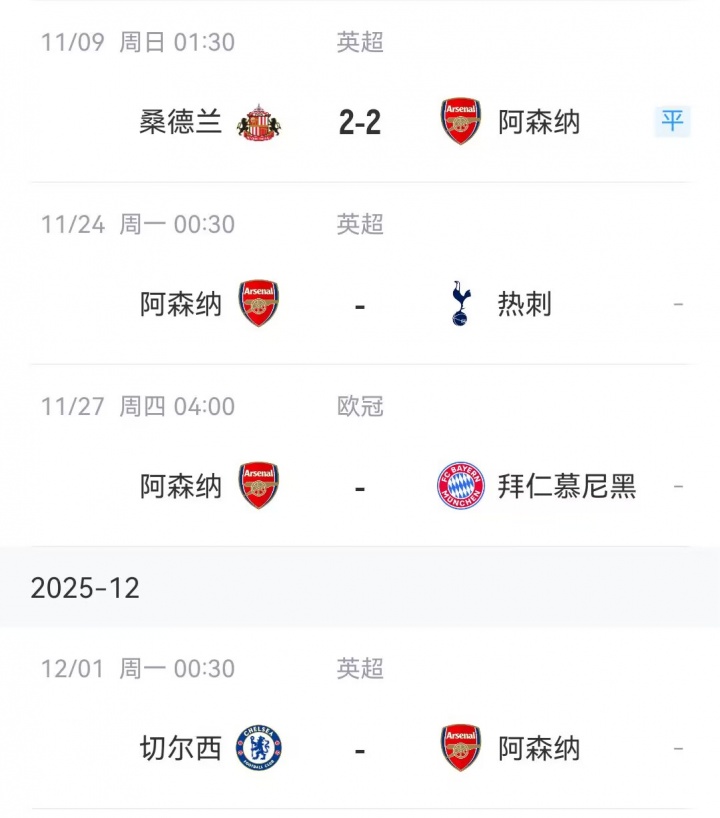 被桑德兰绝平!阿森纳各赛事10连胜终结,后3场踢热刺拜仁切尔西