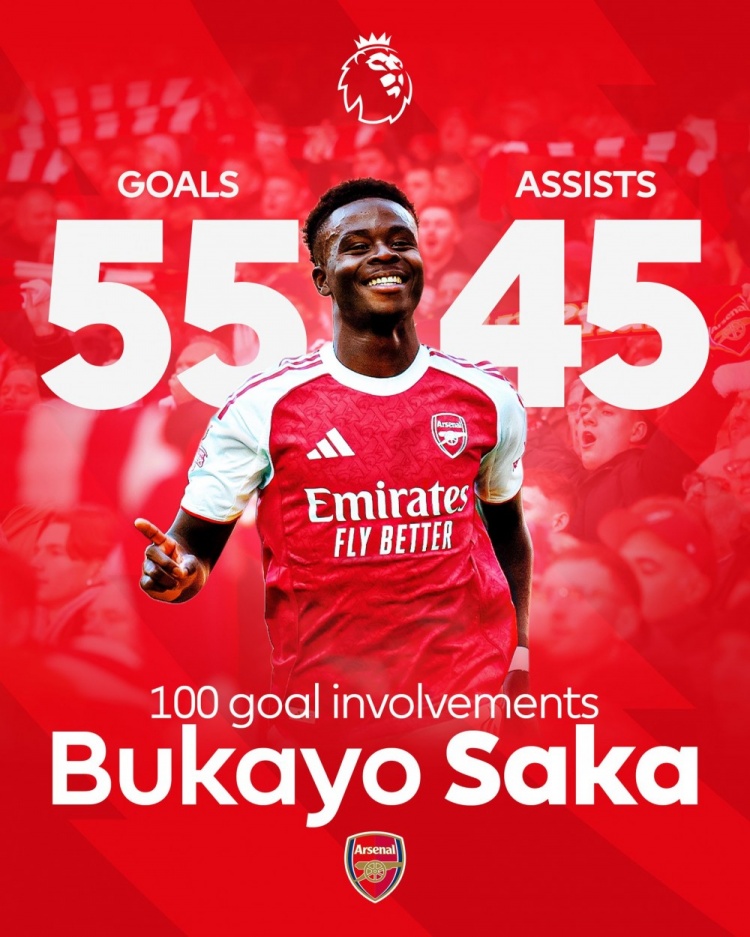 里程碑!英超官方社媒晒海报祝贺萨卡:加入 英超得分 100个👏